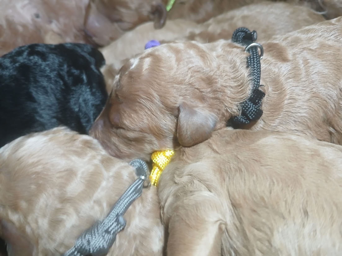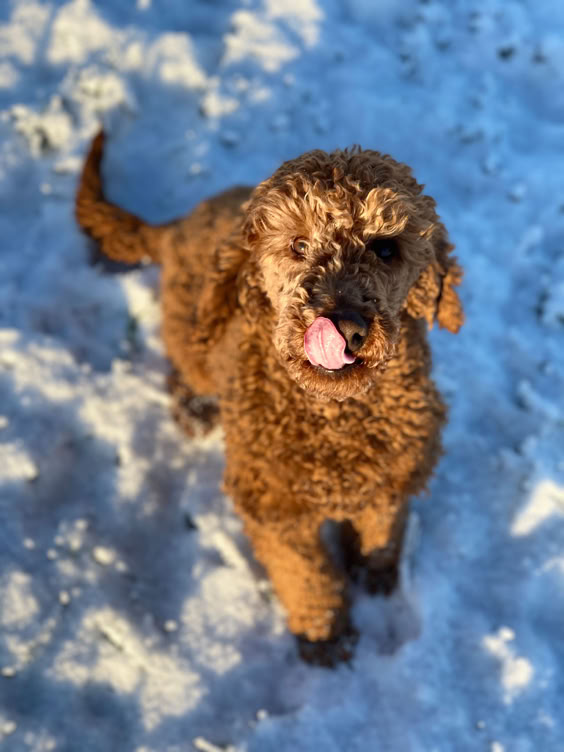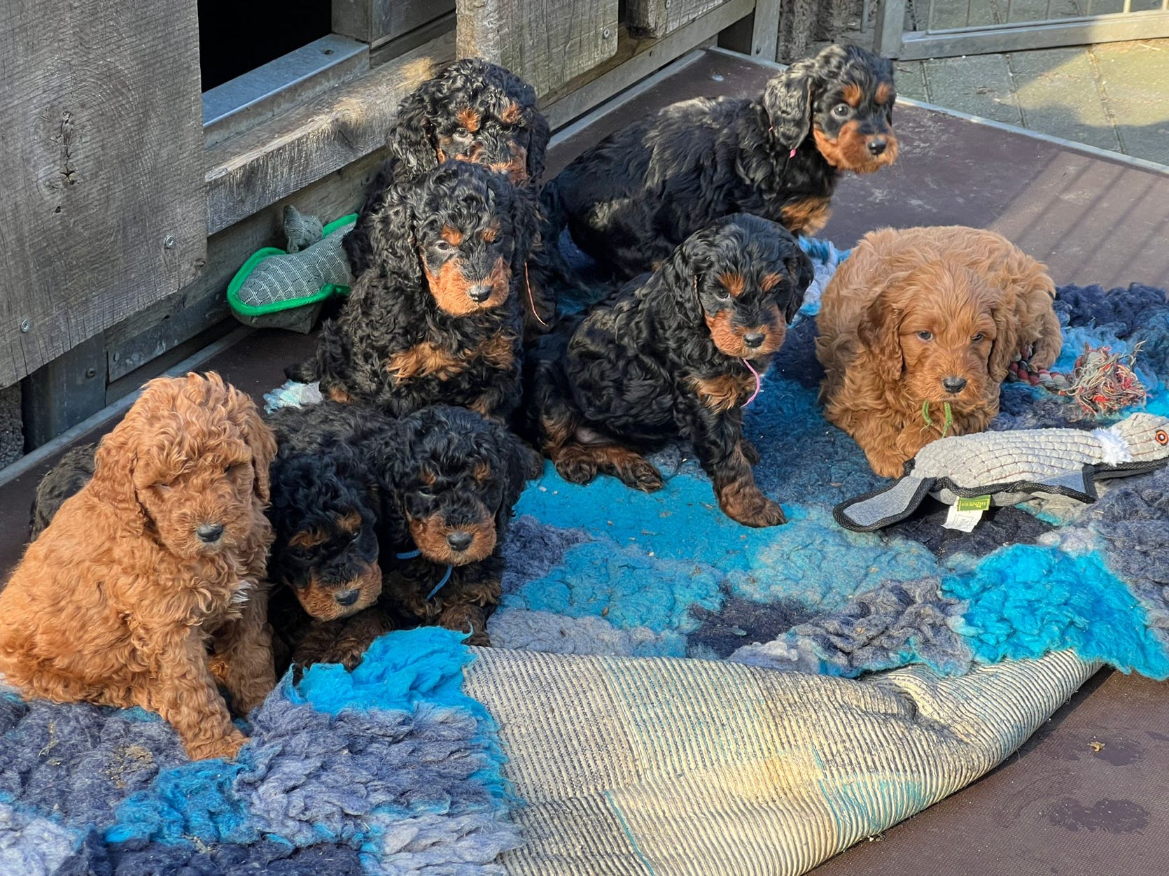 Emma hatte 2025 von Cappa Welpen, diese sind zu fröhlichen sportlichen und leicht fahrbaren Familienhunden heran gewachsen, Gordondoodle F1b in rot und schönem black/tan wie Emma schon zeigt.